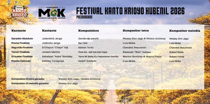 Festival Kanto Krioyo 2026 den kategoria hubenil a konosé su ganadó djabièrnè anochi, alrededor di 12’or. E título a bai pa e kantante hubenil Juliandrick Janga ku su komposishon “Zonido dje panchi” ku a keda komponé pa Wesley Sint Jago i Nelson Anthony.